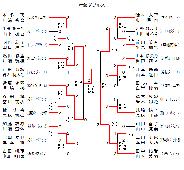 | MD3-11 | アイリスJr | 鈴木 大智・東 惺也 | 2 | 15- 7 15-12 | 0 | 前川 美杏・平畠 柚希 | 津幡南中 | |
