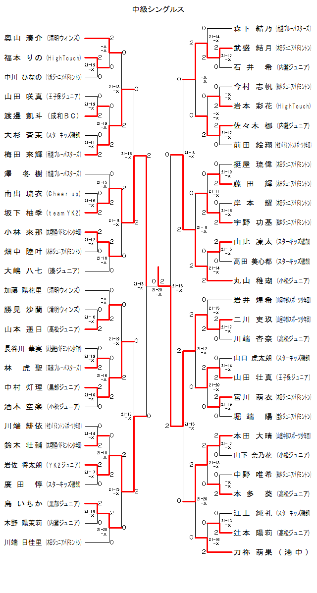 | S3-40 | 南越ブルーバスターズ | 梅田 來輝 | 2 | 21-13 -X | 0 | 奥山 湊介 | 清明ウィンズ | |