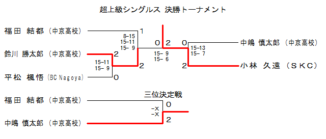 | S1-2 | ’†‹ž‚ | —é쟑¾˜Y | ‚Q | 8-15 15-11 15- 9 | ‚P | •Ÿ“c Œ‹“s | ’†‹ž‚ | |